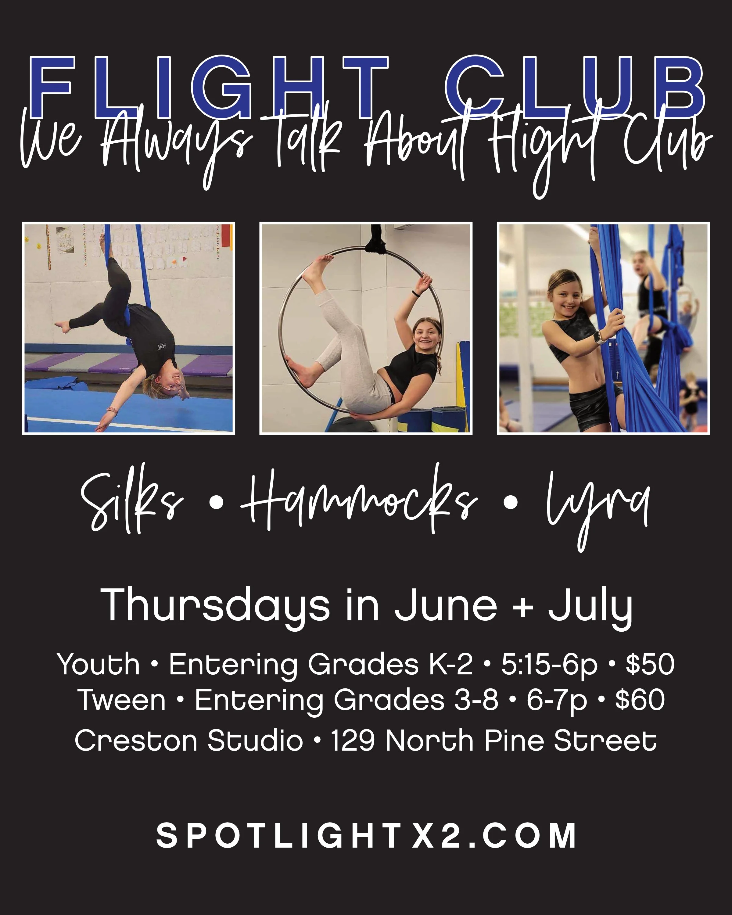 Join Spotlight Alumni for a taste of different dance styles like hip hop, lyrical, jazz, and acro. Perfect for new students or anyone who loves to move! Drop-in or register for the month.