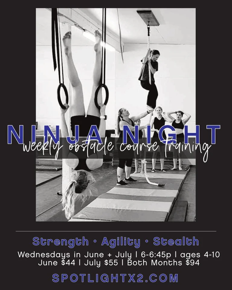 Ninja Night is 45 minutes of fun acrobatics combined with obstacle courses and parkour training. Students develop strength and agility while practicing skillful spins, rolls, jumps, and kicks on the ground.